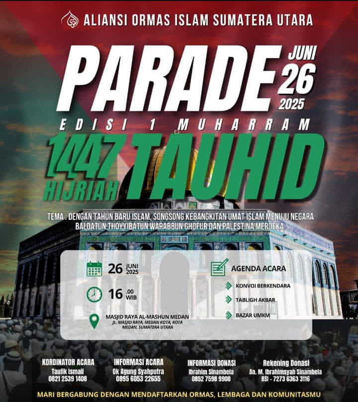 Medan, 17 Juni 2025 — Dalam rangka menyambut tahun baru Islam 1 Muharram 1447 Hijriah, Aliansi Ormas Islam Sumatera Utara akan menggelar kegiatan akbar bertajuk Parade Edisi 1 Muharram yang dipusatkan di kawasan Masjid Raya Al-Mahsun, Kota Medan.