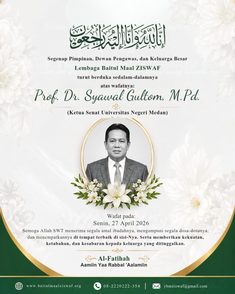 “Kami segenap keluarga besar Baitul Maal ZISWAF turut berduka cita yang sedalam-dalamnya atas wafatnya Prof. Dr. Syawal Gultom. Beliau adalah sosok yang berdedikasi tinggi dalam dunia pendidikan dan telah banyak memberikan manfaat bagi masyarakat,” ujar Warsid, Senin (27/4/2026).