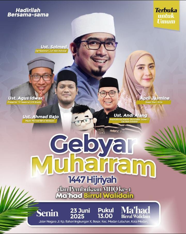Medan, — Dalam rangka menyambut Tahun Baru Islam 1 Muharram 1447 H, Ma’had Birrul Walidain menggelar acara istimewa bertajuk Gebyar Muharram sekaligus meresmikan pembukaan Ma’had Halaqah Qur’an (MHQ) ke-1. Acara ini akan diselenggarakan pada: