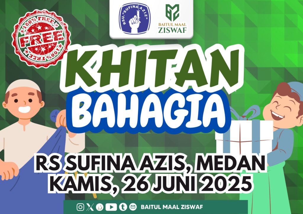 Medan – Dalam rangka mengisi liburan dengan kegiatan yang bermanfaat, RSU Sufina Aziz Medan bekerjasama dengan Baitul Maal ZISWAF akan menggelar Khitan Bahagia, sebuah kegiatan khitanan massal gratis untuk anak-anak yatim dan dhuafa. Kegiatan ini akan dilaksanakan pada: