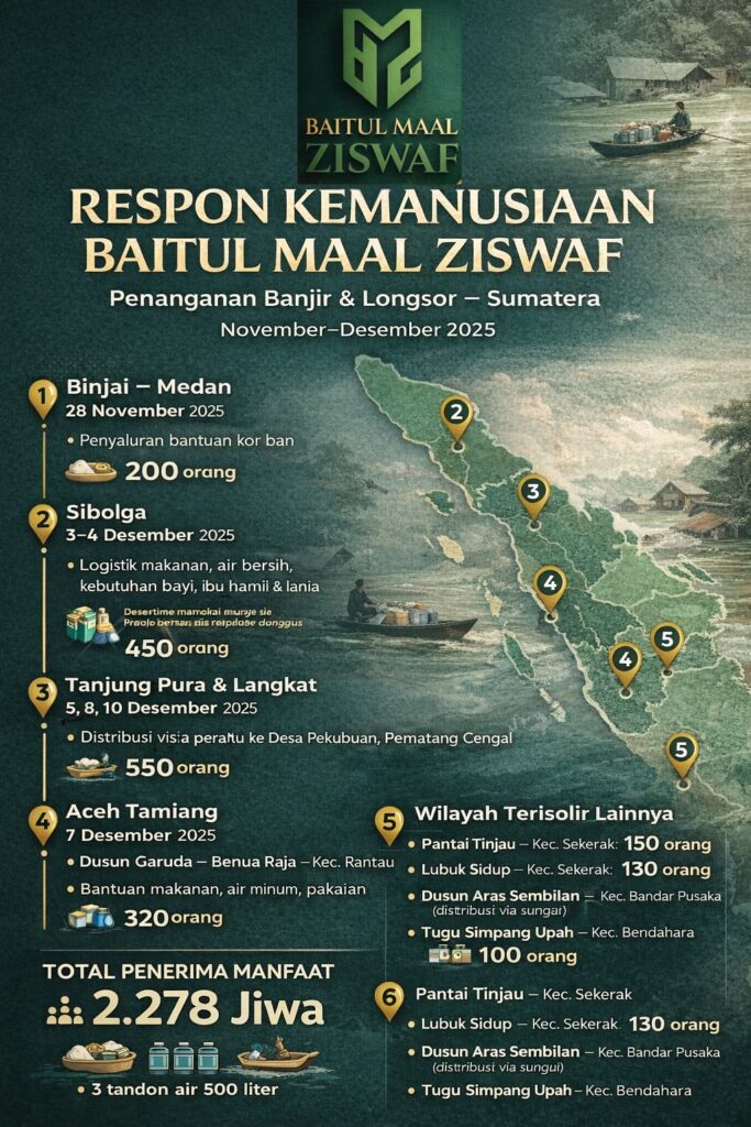 Binjai–Medan–Sibolga–Langkat–Aceh Tamiang, Desember 2025 —Baitul Maal ZISWAF (BMZ) melaksanakan rangkaian Program Kemanusiaan untuk Korban dan Penyintas Banjir serta Longsor di sejumlah wilayah terdampak bencana di Sumatera Utara dan Aceh. Penyaluran bantuan dimulai sejak 28 November hingga 12 Desember 2025, dengan total penerima manfaat mencapai lebih dari 2.000 jiwa.