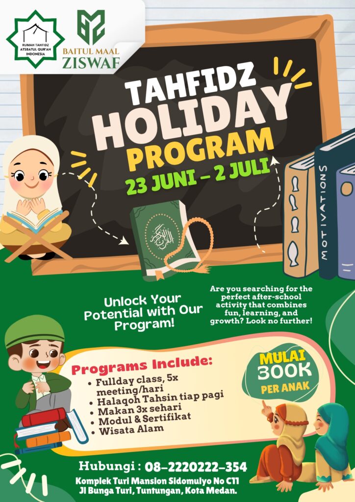 Medan, 17 Juni 2025 – Baitul Maal ZISWAF bekerja sama dengan Rumah Tahfidz Atsbatul Qur’an Indonesia menghadirkan program spesial bertajuk Tahfidz Holiday Program yang akan diselenggarakan pada 23 Juni hingga 2 Juli 2025, bertempat di Asrama Tahfidz Atsbatul Qur’an Indonesia, Komplek Turi Mansion, Jl. Bunga Turi, Tuntungan, Kota Medan.