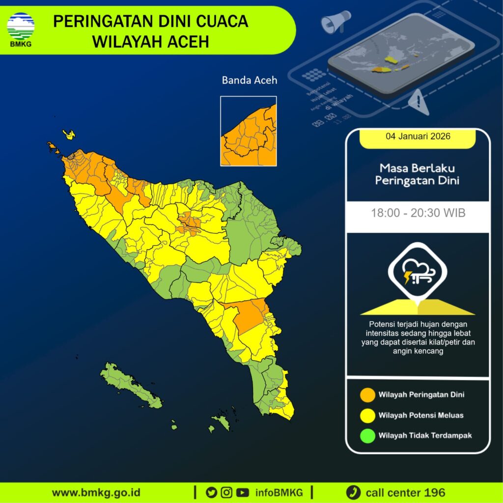 ACEH | titikterang-news – Badan Meteorologi, Klimatologi, dan Geofisika (BMKG) Aceh mengeluarkan update peringatan dini cuaca pada Sabtu, 04 Januari 2026 pukul 17.54 WIB. BMKG menyampaikan potensi hujan dengan intensitas sedang hingga lebat, yang dapat disertai kilat/petir dan angin kencang, mulai pukul 18.00 WIB.