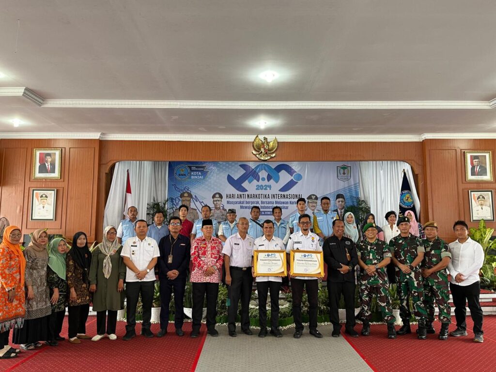 Asisten Pemerintahan dan Kesejahteraan Rakyat Setda Kota Binjai Aldi Agustian, S.Sos, MM menghadiri peringatan Hari Anti Narkotika Internasional (HANI) Tahun 2024 yang digelar oleh Badan Narkotika Nasional Kota Binjai dengan tema “Masyarakat Bergerak, Bersama Melawan Narkoba Mewujudkan Indonesia Bersinar”, di Pendopo Umar Baki, Rabu (26/6).