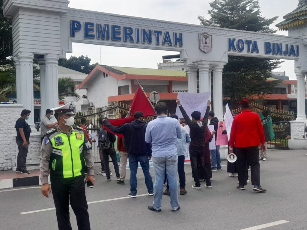Puluhan mahasiswa yang menamakan diri “Aksi Mahasiswa Bersatu” melakukan aksi demo di depan kantor Wali Kota Binjai jalan Jendra Sudirman kecamatan Binjai Kota, Rabu (19/1/2022) sekira pukul 11.45 Wib.