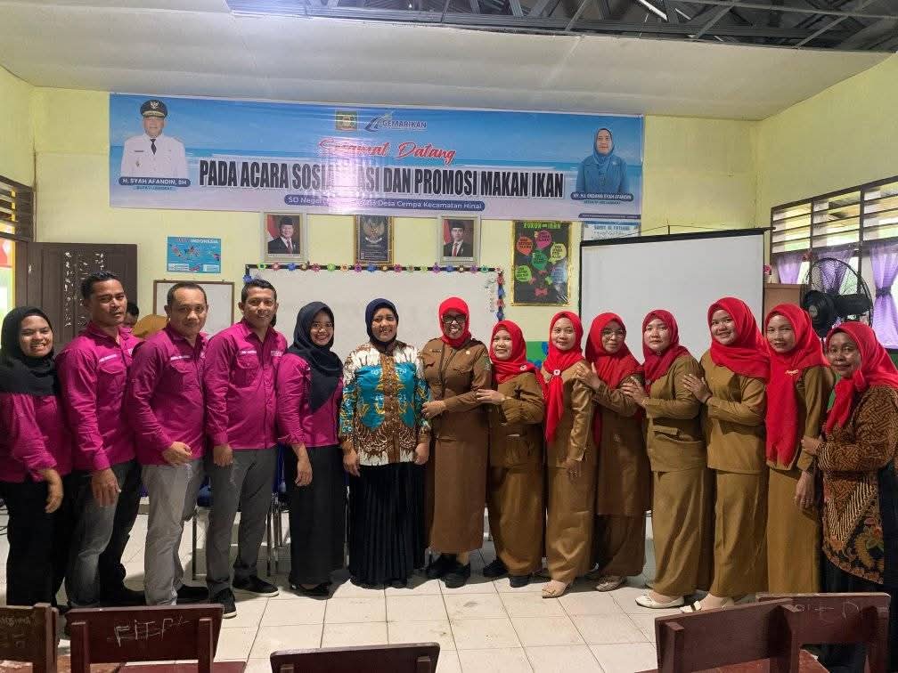 Ketua TP PKK Kabupaten Langkat, Ny. Endang Kurniasih Syah Afandin, menunjukkan komitmennya dalam mendukung peningkatan gizi anak melalui kegiatan Gerakan Memasyarakatkan Makan Ikan (GEMARIKAN) yang diselenggarakan oleh Dinas Perikanan Kabupaten Langkat, Senin (16/6/2025) di SD Negeri 057213, Desa Cempa, Kecamatan Hinai.