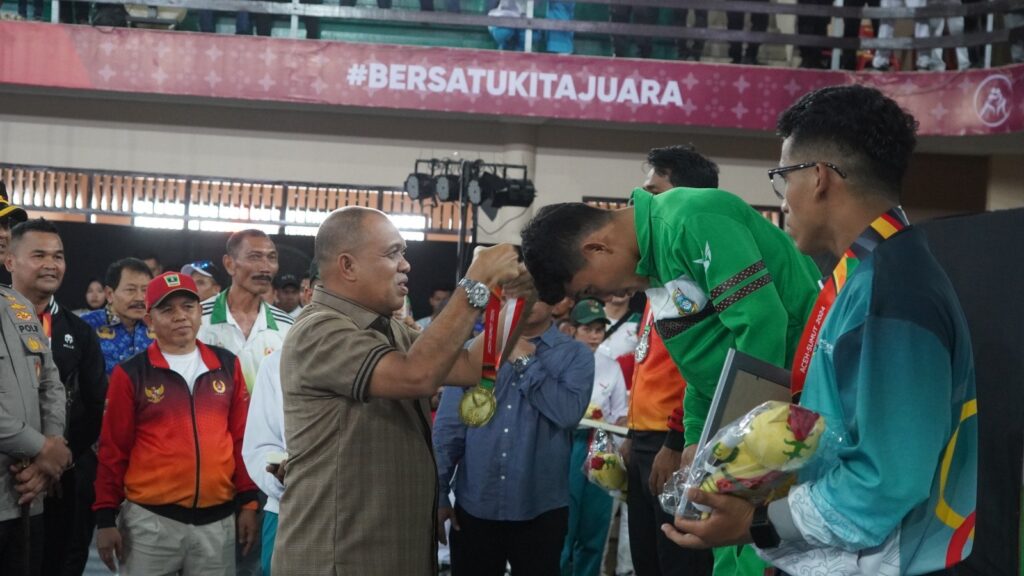 Pj. Bupati Langkat, H.M. Faisal Hasrimy, AP, M.AP, bersama Kapolres Langkat AKBP David Triyo Prasojo, SH, SIK, M.Si., secara resmi menyerahkan medali kepada para juara cabang olahraga Sambo yang berlangsung di Gedung Olahraga Manunggal Langkat Berseri, Stabat, Senin (17/9/2024). Turut mendampingi dalam acara tersebut Kepala Dinas Pemuda dan Olahraga Langkat, Ngaturken PA, M.Pd, serta Analis Kebijakan Ahli Utama, dr. Indra Salahudin, M.Kes, MM.