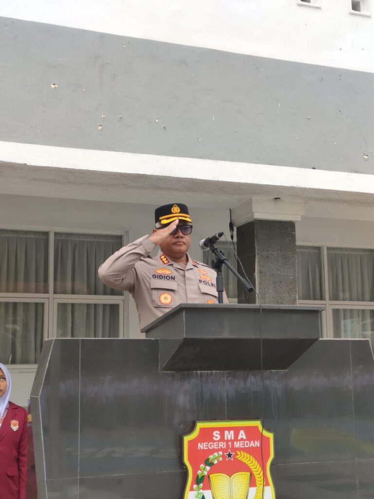MEDAN- Titikterang | Kapolrestabes Medan, Kombes Pol Gidion Arif Setyawan hadir sebagai pembina upacara di SMAN 1 atau Smansa Medan, Jalan Teuku Cik Ditiro No 1, Medan, Sumatera Utara, Senin (5/5). Pada momen tersebut, Gidion menyinggung soal Indonesia Emas 2045. Ia mengatakan, 20 tahun lagi Indonesia akan menyongsong 2045 atau tahun Indonesia Emas.